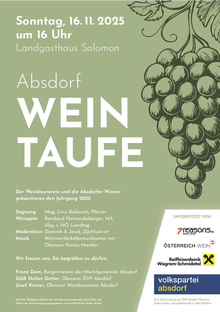 Die ÖVP lädt gemeinsam mit dem Weinbauverein zur traditionellen Weintaufe ins Landgasthaus Salomon. Alle Details bitte dem Flyer entnehmen! Wir freuen uns auf Ihr Kommen!